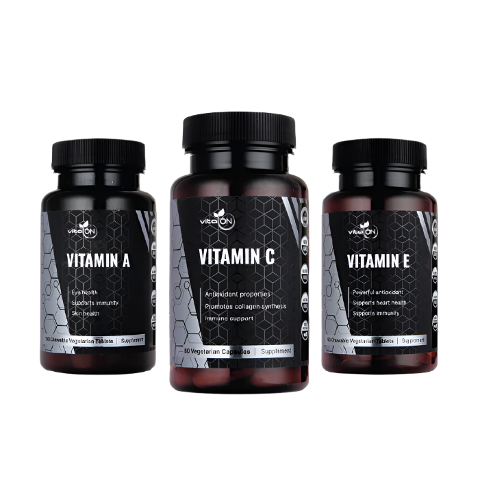 Ο συνδυασμός των βιταμινών A, C & E είναι ένας καλός και εύκολος τρόπος να προσλάβετε τις απαραίτητες ποσότητες από αυτές τις αναντικατάστατες βιταμίνες. Εκτός από το ότι θα εκπληρώσουν τις λειτουργίες τους στον οργανισμό σας, η ταυτόχρονη λήψη τους θα προσφέρει αδιάτρητη προστασία ενάντια στις ελεύθερες ρίζες. Κάθε μία από αυτές τις βιταμίνες έχει τις μοναδικές της ιδιότητες, ενώ το κοινό τους χαρακτηριστικό είναι η ισχυρή Αντιοξειδωτική δράση, η οποία εκφράζεται μέσω διαφορετικών μηχανισμών.