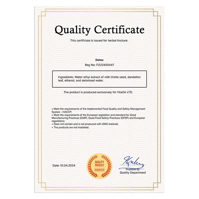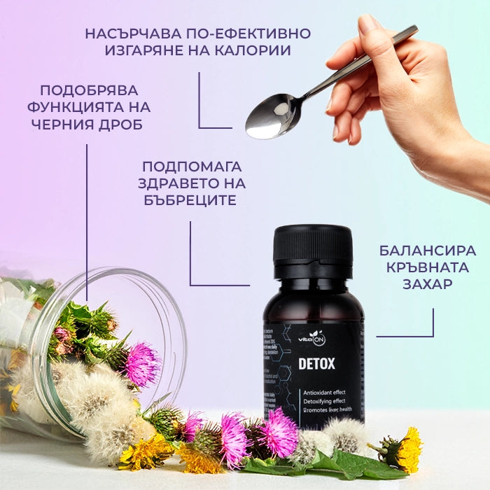 Το βάμμα “Detox” είναι ισχυρός συνδυασμός αλκοολικού εκχυλίσματος δύο θεραπευτικών φυτών - Πικραλίδα και Γαϊδουράγκαθο.