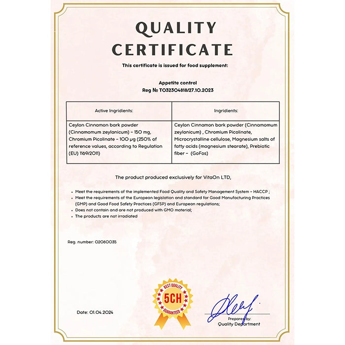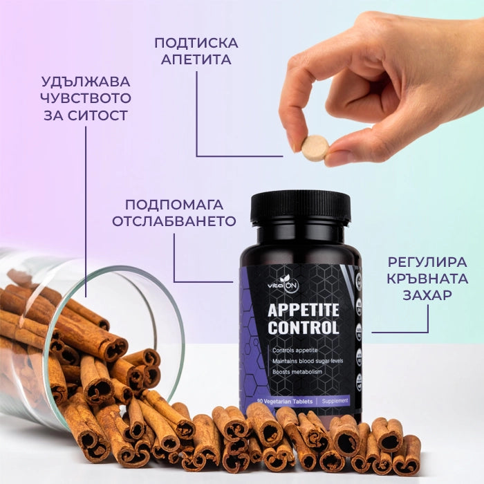 Το Appetite Control είναι ένα συμπλήρωμα διατροφής σε μορφή δισκίου του VitaOn, το οποίο περιέχει κανέλα Κεϋλάνης (φλοιός) και την οργανική μορφή του στοιχείου Χρώμιο - πικολινικό χρώμιο.