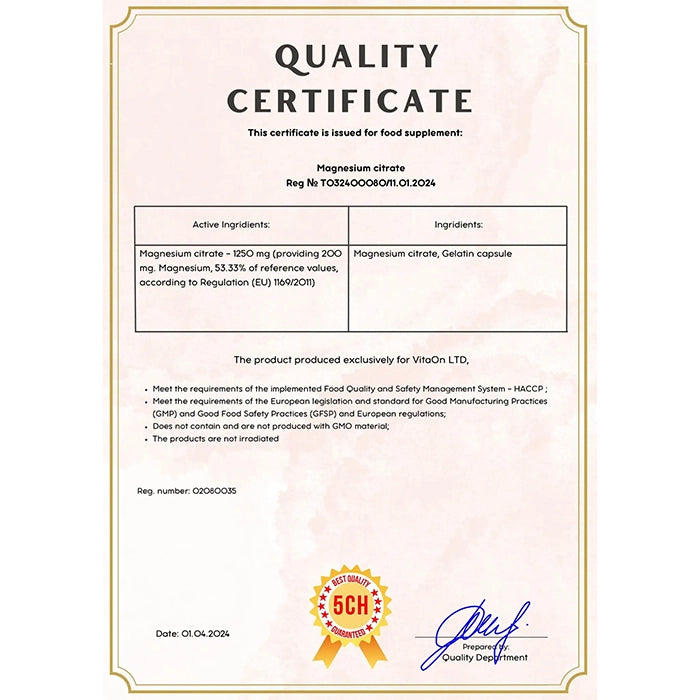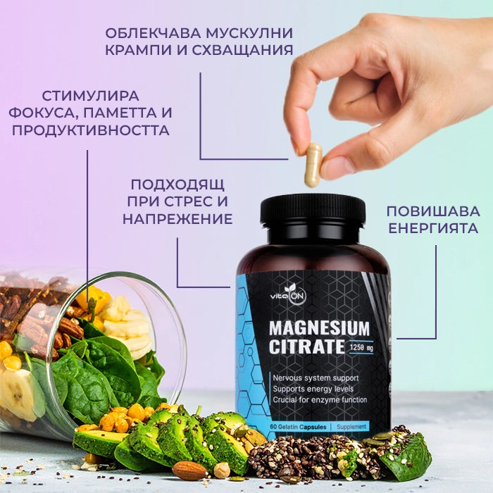 Λαμβάνοντας κιτρικό μαγνήσιο ως συμπλήρωμα διατροφής, διασφαλίζουμε ότι το σώμα μας χρειάζεται αυτό το ορυκτό για να απολαμβάνει τέλεια υγεία και υψηλή απόδοση. Η υψηλή πεπτικότητα του προϊόντος της VitaOn διασφαλίζει την ταχεία είσοδο στην κυκλοφορία του αίματος και την έναρξη των θετικών επιδράσεων.