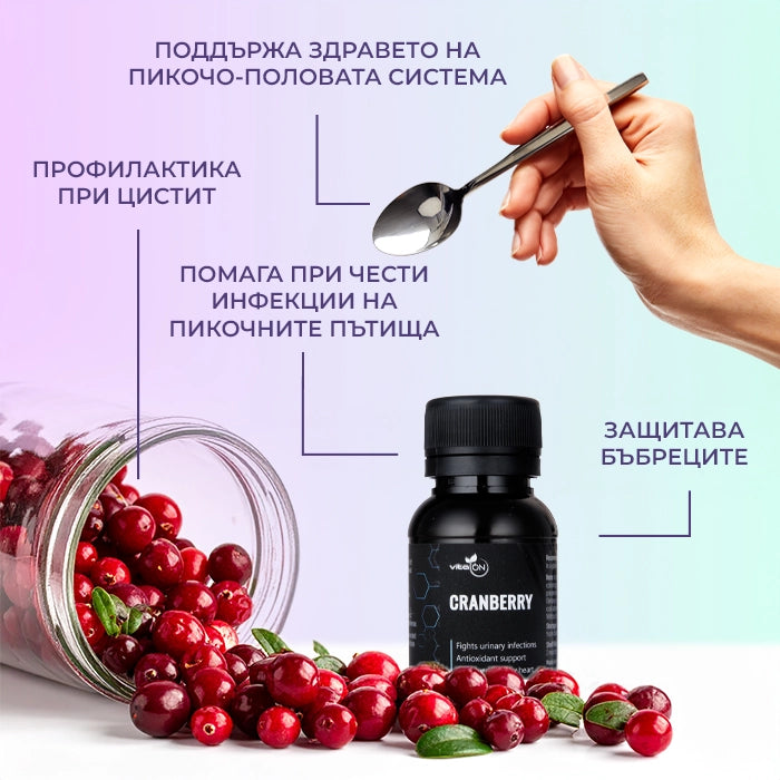 Η αλκοολούχα βάμμα από κόκκινο κράνμπερι της VitaOn αποτελεί υψηλής ποιότητας υδατοαλκοολικό εκχύλισμα από τους καρπούς του φυτού Vaccinium macrocarpon. Συγκεντρώνει στον εαυτό της μια σειρά από βιοενεργά συστατικά, τα οποία έχουν ποικίλες δράσεις στον ανθρώπινο οργανισμό.