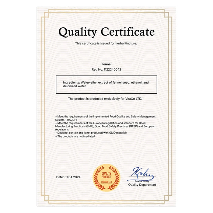 Τα προϊόντα της VitaOn παράγονται με αυστηρή τήρηση των διαδικασιών παραγωγής και αυστηρό έλεγχο σε κάθε στάδιο, εξασφαλίζοντας υψηλή ποιότητα και ασφάλεια.