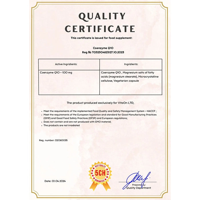 Το Coenzyme Q10 της Vitaon είναιένα συμπλήρωμα διατροφής υψηλής ποιότητας σε μορφή κάψουλας που περιέχει την ομώνυμη ουσία, γνωστή και ως Ubiquinone.
