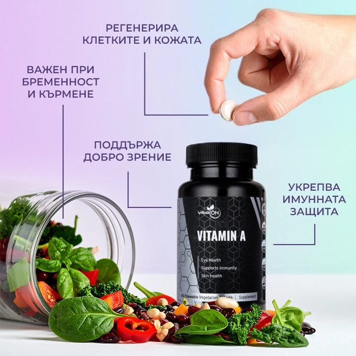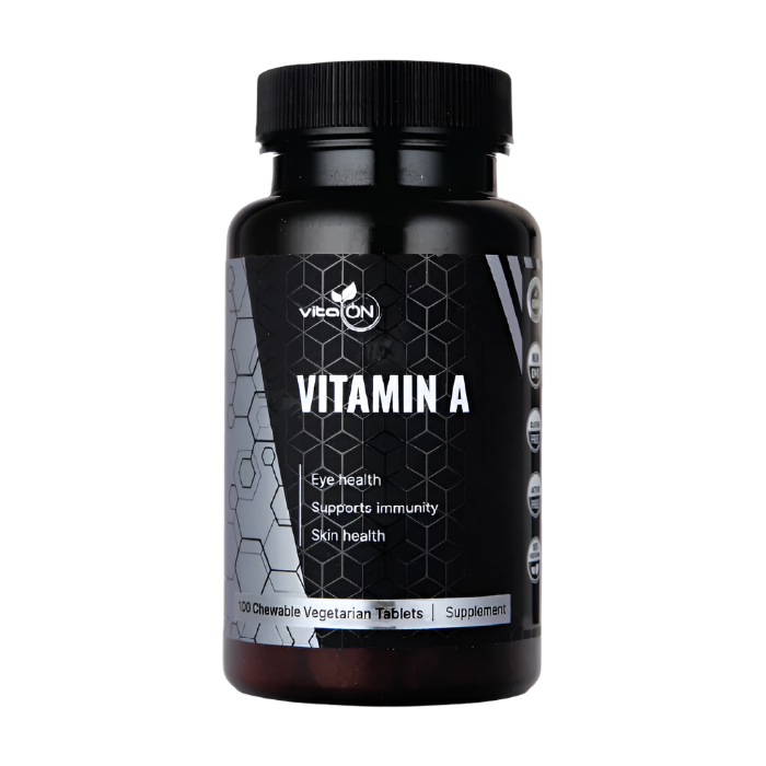Η Βιταμίνη Α της VitaOn είναι ένα συμπλήρωμα διατροφής με τη μορφή μασώμενων δισκίων που περιέχουν τις ποσότητες που χρειάζεστε από την αναντικατάστατη βιταμίνη, γνωστή και ως οξική ρετινόλη. Είναι ζωτικής σημασίας γιατί το σώμα μας δεν μπορεί να το συνθέσει μόνο του. Γι' αυτό το λαμβάνουμε μέσω τροφής ή με τη μορφή συμπληρώματος.
