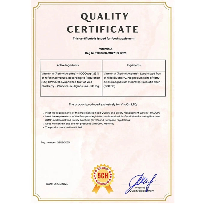 Παίζει βασικό ρόλο στην υγεία της οφθαλμικής συσκευής και της όρασης, συμμετέχει στην εμβρυϊκή ανάπτυξη, διατηρεί το ανοσοποιητικό μας σύστημα υγιές και σε κατάσταση.