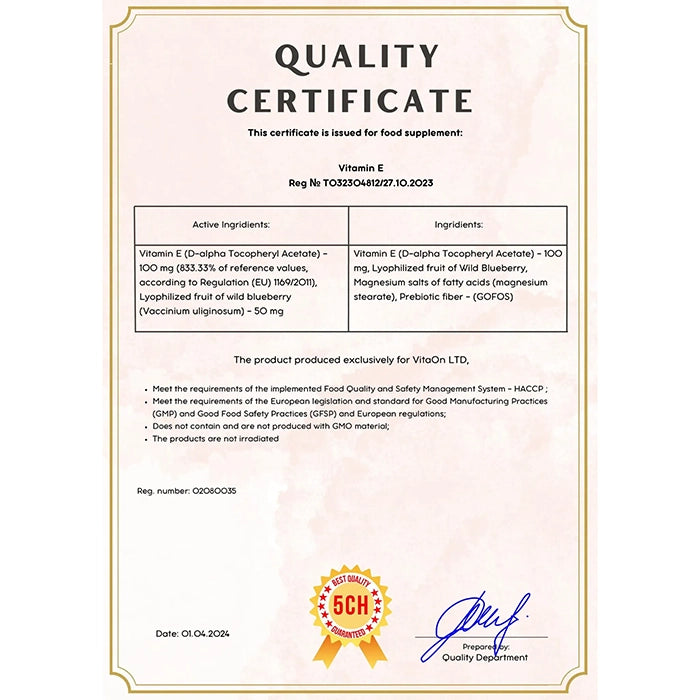 Η βιταμίνη Ε της VitaOn είναι ένα προϊόν υψηλής ποιότητας που θα είναι στην πρώτη γραμμή μαζί σας στον αγώνα κατά των ελεύθερων ριζών.